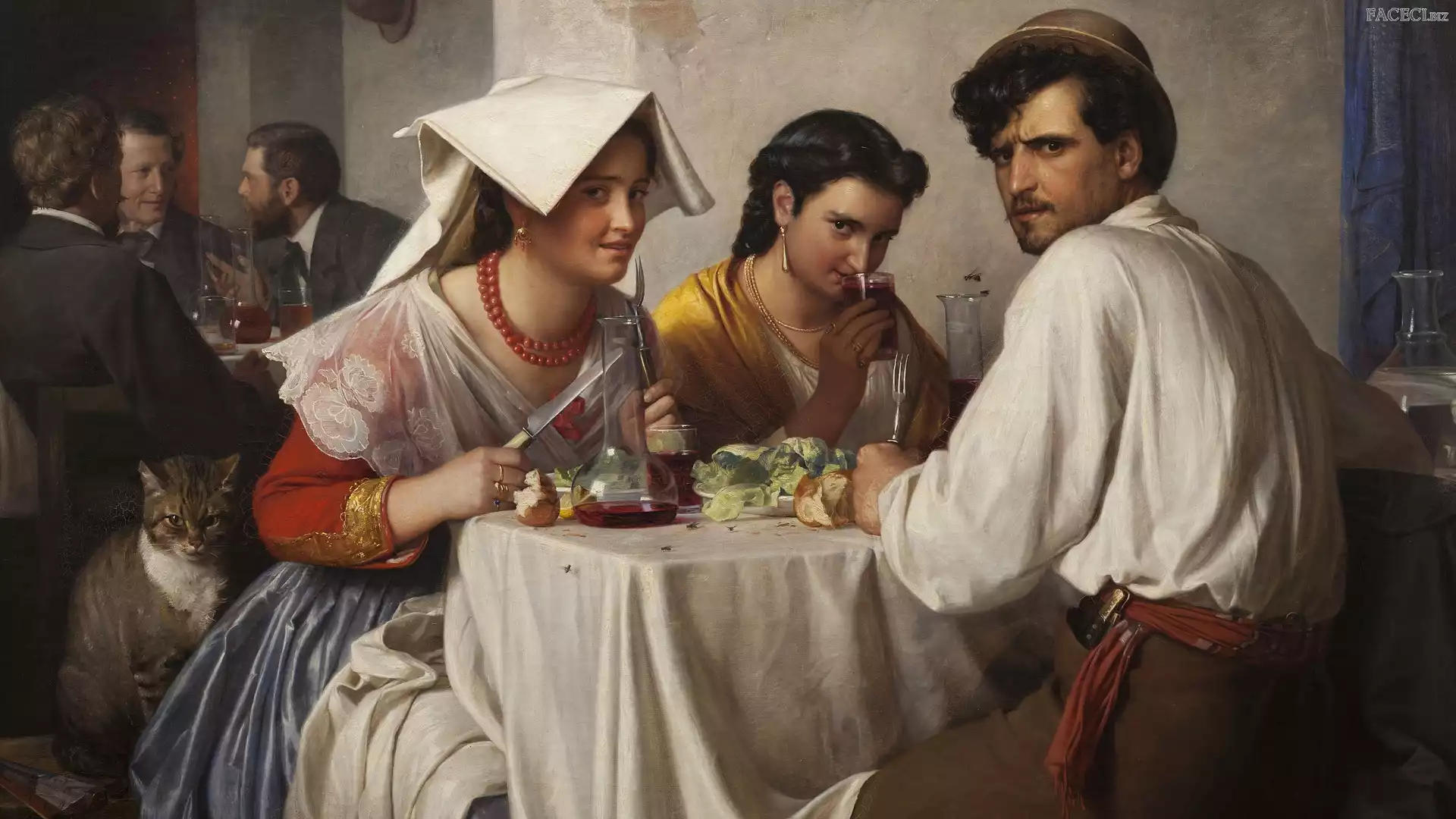 Dwie, Jedzenie, Mężczyźni, Stolik, Malarstwo, Obraz, Kot, Restauracja, Carl Bloch, Kobiety - faceci.biz